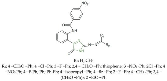 On the other hand, to obtain the compounds presented in Figure 17, a series of novel hydrazone–imidazole derivatives were synthesized by Badrey et al. as potential α-amylase inhibitors for type 2 diabetes management. The findings of this in silico study support the potential of imidazole-based scaffolds as antihyperglycemic agents. Among the synthesized analogues, compounds bearing electron-withdrawing groups, such as chloro- and nitro-substituents, exhibited the highest α-amylase inhibitory potency, with predicted binding energies ranging from −9.2 to −11.4 kcal mol−1 in molecular docking studies—values that surpassed those of the standard drug acarbose (−8.7 kcal mol−1) [61].
