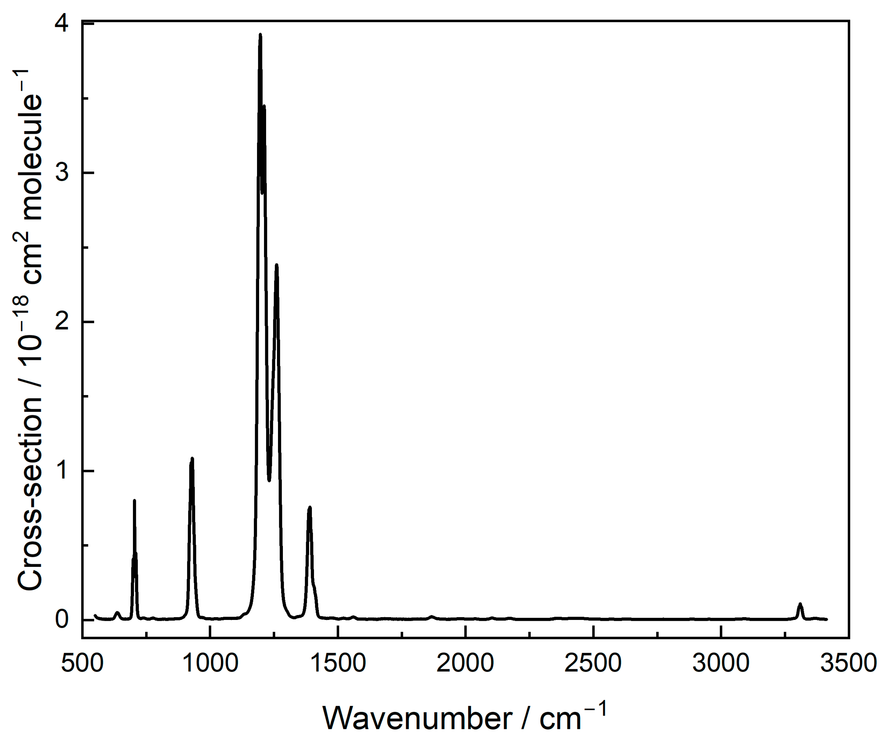 - van Hoomissen, D.; Papadimitriou, V.C.; Burkholder, J.B. Low frequency (<500 cm−1) contribution to greenhouse gas radiative efficiency. Mol. Phys. 2024, 122, e2273412. [Google Scholar] [CrossRef]
