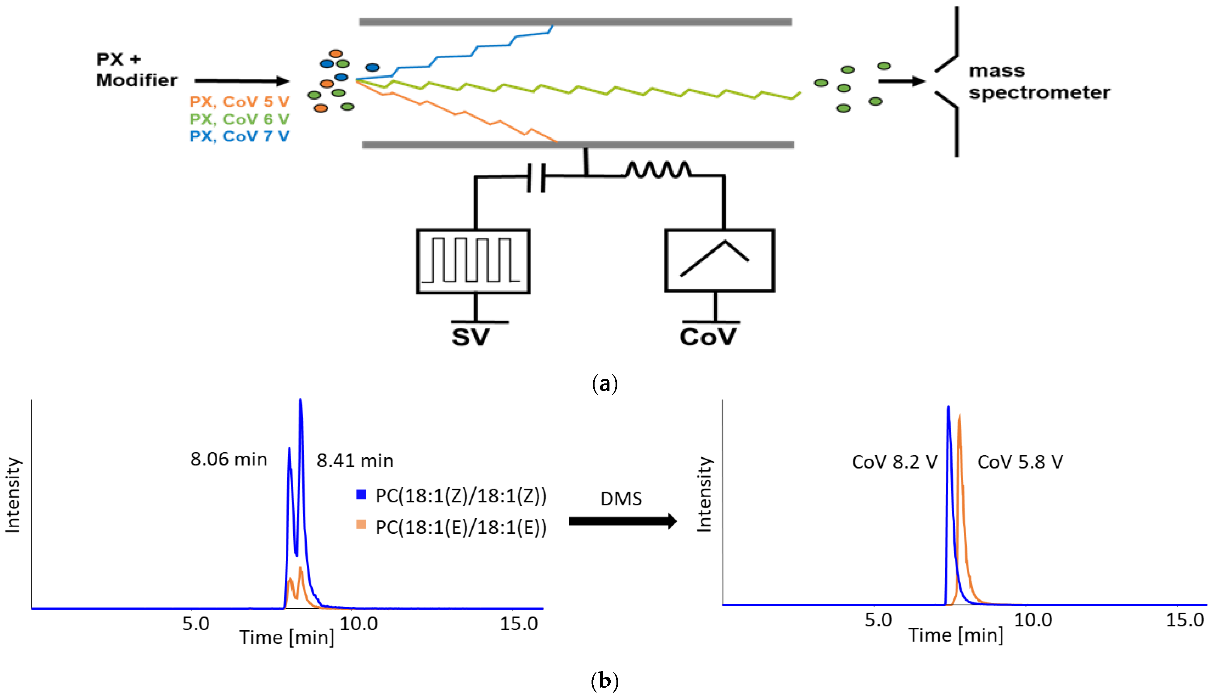 - Baker, P.R.S.; Armando, A.M.; Campbell, J.L.; Quehenberger, O.; Dennis, E.A. Three-dimensional enhanced lipidomics analysis combining UPLC, differential ion mobility spectrometry, and mass spectrometric separation strategies. J. Lipid Res. 2014, 55, 2432–2442. [Google Scholar] [CrossRef] [PubMed]