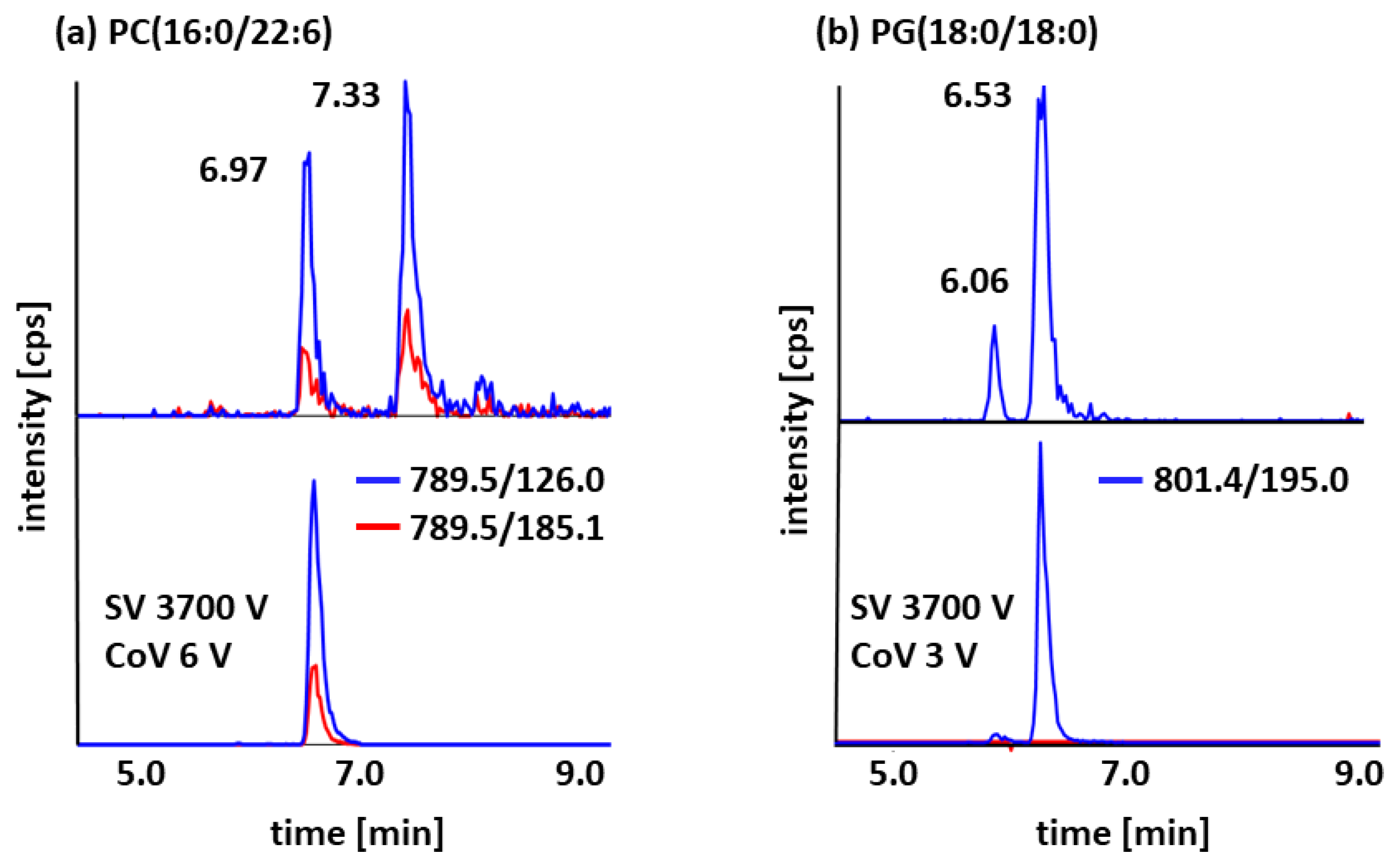 - Nakanishi, H.; Ogiso, H.; Taguchi, R. Qualitative and quantitative analyses of phospholipids by LC-MS for lipidomics. Methods Mol. Biol. 2009, 579, 287–313. [Google Scholar] [CrossRef]