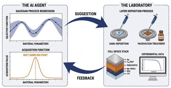 In the above context, the introduction of Artificial Intelligence (AI) and Machine Learning (ML) methods is driving a paradigm shift in materials discovery from raw data analysis to active rational design [18,19,20]. In the field of molecular screening, ML modeling with molecular descriptors has made it possible to discover suitable additives from large chemical libraries [21]. For example, the recently developed Co-PAS (Co-Pilot for Perovskite Additive Screener) framework combines molecular backbone classification with deep learning for screening effective organic additives, thus overcoming the prediction bias common in small datasets [22]. In addition to static screening, Active Learning (AL) algorithms such as PLATIPUS and Bayesian Optimization (BO) have demonstrated the ability to optimize complex formulations and process windows with limited experimental budgets. These methods have significantly accelerated the discovery of crystal phases and efficient devices by intelligently balancing exploration and exploitation, and they have achieved better results with fewer iterations compared to random sampling [16,23].