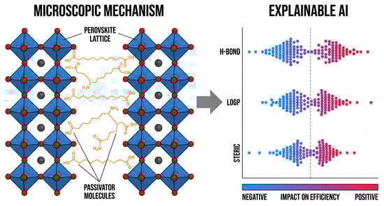 Integrating microscopic mechanisms with explainable AI. (Left): Schematic of perovskite grain boundaries, where passivating molecules (orange) anchor to lattice defects. (Right): Corresponding visualization provided by explainable AI, represented using SHAP swarm plots. This figure quantifies the impact of specific molecular features—such as hydrogen bonding, LogP values, and steric effects—on device performance, enabling rational design based on distinct chemical mechanisms. The vertical dashed line indicates a SHAP value of zero, separating negative (left) and positive (right) impacts.