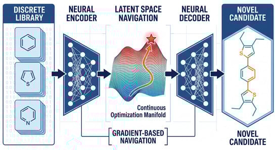 Schematic of generative inverse design via latent space navigation. Discrete molecular structures from existing databases (left) are mapped to a continuous low-dimensional latent space via an encoder. Within this differentiable manifold, optimization algorithms perform gradient-based navigation (orange trajectories) across the property landscape (colored surface) to identify the optimal solution (red star). A decoder then reconstructs these optimized latent vectors into novel candidates (right), molecules that may not exist in the original training dataset.