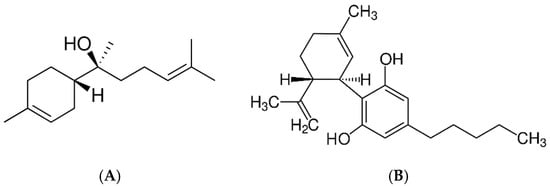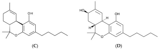 The main compounds found in methanol extract from C. sativa flowers: (A) α-bisabolol, (B) cannabidiol, (C) Δ9-tetrahydrocannabinol and (D) 8-ß hydroxy-d 9-tetrahydrocannabinol.