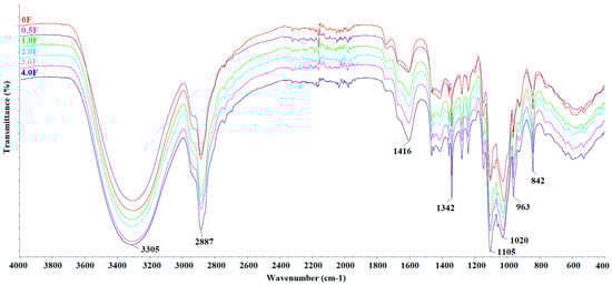 Figure 3 shows the FTIR spectra of all fabricated films. The following bands were observed: 3304 cm−1, 2887 cm−1, 1416 cm−1, 1342 cm−1, 1104 cm−1, 1020 cm−1, 962 cm−1, and 842 cm−1. The broad band at 3304 cm−1 can be attributed to O–H and C–H stretching vibrations, while the band at 2887 cm−1 corresponds to C–H stretching in methyl and methylene groups. The band at 1416 cm−1 is associated with C–OH stretching, and the bands at 1104 cm−1, 1020 cm−1, 962 cm−1, and 842 cm−1 are typical for C–O–C and C=H vibrations [27,28]. The FTIR spectra of all films are similar, with no new bands or significant shifts observed. Differences in the intensity of certain bands were noted depending on the amount of extract used, which may reflect changes in the film composition. These observations confirm the presence of the expected functional groups in the polysaccharide films and the incorporation of the cannabis flower extract [29,30]. Surface morphology analysis of the films using SEM (scale 10 µm, Figure 4) revealed smooth and homogeneous surfaces for all samples, regardless of the extract concentration. These features indicate a continuous and coherent polysaccharide matrix in which the extract is evenly distributed. The homogeneous film surface may suggest a favourable distribution of active compounds within the matrix, which is a desirable property for potential application in functional packaging materials.
