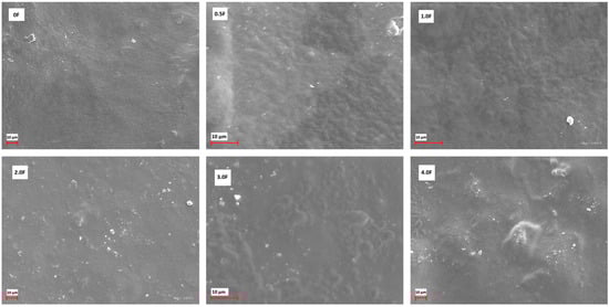 SEM images for active films: 0 F, 0.5 F, 1.0 F, 2.0 F, 3.0 F and 4.0 F.
