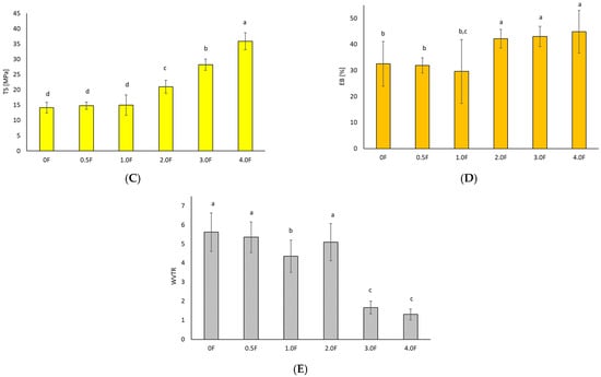 Figure 5 shows the results of the film tests (A) density, (B) swelling index, (C) tensile strength, (D) elongation at break, and (E) WVTR. It can be clearly observed that the density of the film increases with the increase in the extract additive. The greatest increase in density was observed in films 3.0 F and 4.0 F, i.e., 93.25 ± 6.48 [10−2 g/cm3] and 95.52 ± 3.00 [10−2 g/cm3]. This is the result of greater cross-linking due to the interaction of active compounds in the extract and the polysaccharide matrix [31]. The higher the extract content, the higher the density of the obtained films, which had a direct impact on their physical properties. A decrease in the swelling coefficient was also observed with an increase in the extract. The swelling index measures the maximum water absorption ability of the film before its structural damage, reflecting its potential usefulness as a water transmission material. Swelling behaviour is largely dependent on the extent of intermolecular interactions in polymer chains [32].