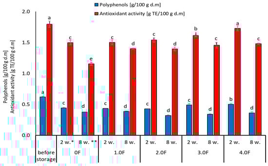 Changes in the content of phenolic compounds and antioxidant activity of blubbery during storage. The letters (a, b, c, …) next to the mean values indicate statistical significance of differences be-tween groups, determined by a post-hoc test (Tukey).