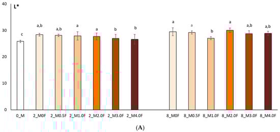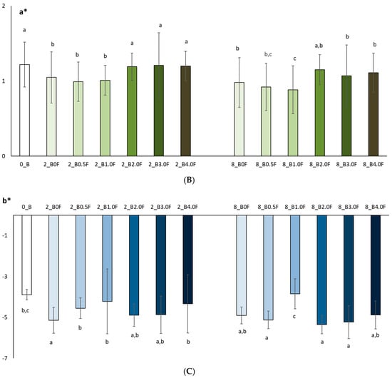 Colour measurements (L* (A), a* (B), b* (C)) of polysaccharide films before and after 8 weeks of fruit storage. The letters (a, b, c, …) next to the mean values indicate statistical significance of differences be-tween groups, determined by a post-hoc test (Tukey).