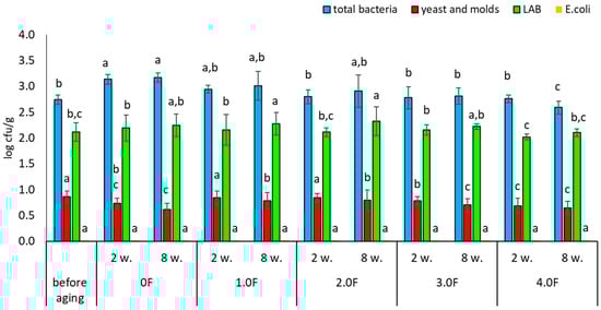 The microbiological quality of freeze-dried fruits, including raspberries, represents an important area of research in the context of food safety and maintaining high quality of the final product. Although freeze-drying is considered an effective preservation method, allowing the retention of nutritional value and a significant extension of shelf life, it does not guarantee the complete elimination of microbiological hazards. Contamination may be introduced at various stages of the technological process—from raw material preparation, through the drying process, to storage and packaging of the product. In the present study, the microbiological stability of freeze-dried raspberries and blueberries was analysed. After the drying process, the fruits were packaged in bioactive films containing C. sativa flower extract, characterized by antimicrobial and antioxidant properties [75]. The obtained results indicate that the type of film used had a measurable, though limited, effect on microbiological changes during fruit storage. The total bacterial count in raspberries after freeze-drying (before packaging) was 2.74 log cfu/g, whereas after 8 weeks of storage in the control film (0 F) it increased to 3.17 log cfu/g (Figure 14). Slightly lower values were observed in samples stored in the tested films, with the lowest level (2.59 log cfu/g) recorded for the 4.0 F film. Although these differences were statistically significant, their absolute magnitude was small, suggesting a moderate stabilizing effect. A similar trend was observed for lactic acid bacteria (LAB); in raspberries stored in the 4.0 F film, no significant changes in LAB counts were recorded compared to the initial values. The most noticeable changes were observed for yeasts and molds. In all stored raspberry samples, a decrease in their counts was noted after 2 and 8 weeks, with the greatest reduction (from 0.86 to 0.64 log cfu/g) recorded in samples stored in the 4.0 F film. However, it should be emphasized that the range of these changes was also limited. In addition, no presence of Escherichia coli was detected in raspberry samples throughout the entire storage period.
