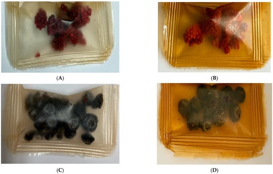 Phenolic compounds and their antioxidant activity play a key role in maintaining the quality of berries during storage. In this study, changes in the content of total polyphenols (TPC) and antioxidant activity (TEAC) in freeze-dried raspberry and blueberry fruits during 8 weeks of storage were analysed, taking into account the packaging film obtained with the addition of various concentrations of C. sativa flower extract (0 F–4.0 F). Figure 9 shows photographs of the resulting films with raspberries and blueberries packed inside them. Studies by Zielonka-Brzezicka et al. (2017) on the antioxidant properties of raspberry and blueberry fruits have shown that freeze-drying not only retains their natural properties but also affects their stability during storage [68]. According to studies, freeze-drying minimizes the loss of valuable bioactive substances; however, after a certain storage time, their activity may decrease, which is typically attributed to polyphenol oxidation and enzymatic reactions [69,70].