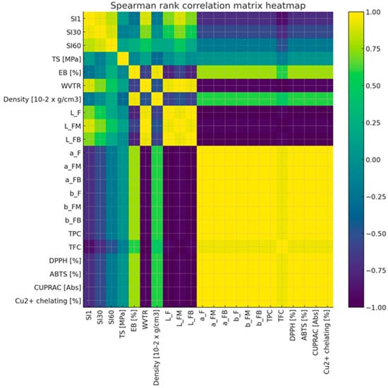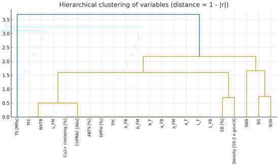 The Spearman’s rank correlation analysis was performed for 22 variables describing the properties of the tested samples. The correlation matrix (Figure 18) revealed a very high level of interdependence—as many as 67.5% of all attribute couples showed a strong correlation (|r| ≥ 0.7), and 35.1% of couples achieved a perfect correlation (|r| = 1.0). In particular, strong correlations were observed between colour indices (L*, a*, b*) and parameters describing antioxidant activity (TPC, DPPH, ABTS, CUPRAC, Cu2+ chelating capacity), which formed consistent blocks of variables. In contrast, film swelling indexes (SI1, SI30, SI60) and other physical parameters, such as density or elongation at break (EB), showed relatively weaker correlations with other groups of characteristics. Hierarchical clustering (Figure 19) (average linkage method, distance = 1 − |r|) was used to reduce the dimensionality. Based on the dendrogram (cut-off threshold: 0.3), 8 clusters of variables were identified. For each cluster, a representative variable was selected, which allowed the number of analysed features to be reduced from 22 to 8 while keeping most of the information contained in the original data set. The proposed set includes: WVTR, L_F, EB [%], density, SI1, SI30, SI60 and TS [MPa]. The cluster representatives for each item were: WVTR—represents the block: WVTR, L_FM, TFC; L_F—representing the block: L_F, L_FB, a_F, a_FM, a_FB, b_F, b_FM, b_FB, TPC, DPPH, ABTS, CUPRAC, Cu2+ chelating; while EB [%], Density [10−2 × g/cm3], SI1, SI30, SI60 and TS [MPa]—provided an independent indicator. This approach would minimise the problem of co-linearity, simplifies models and allows for a clearer interpretation of results.