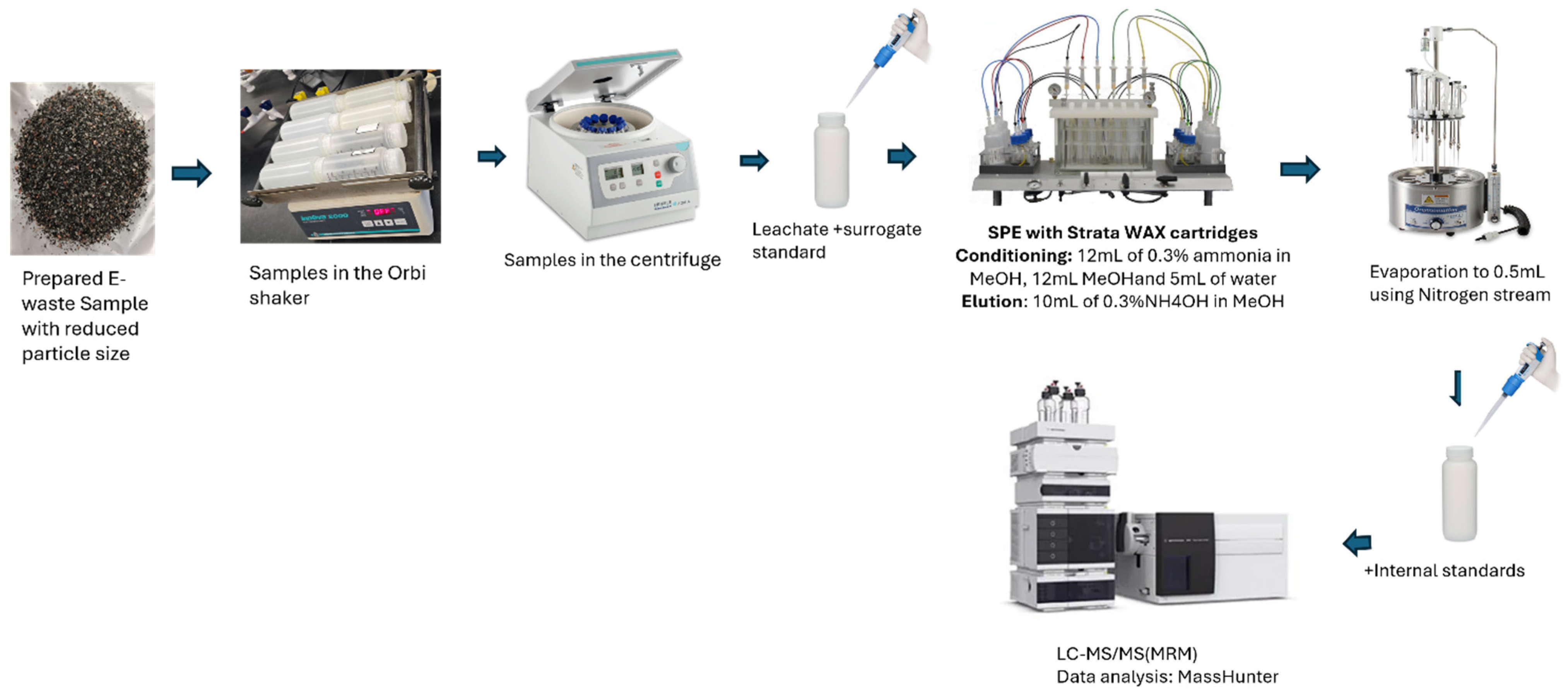 - Gutiérrez-Martín, D.; Castro, G.; González, S.V.; Arp, H.P.H.; López-Serna, R.; Asimakopoulos, A.G. A comprehensive analytical approach to monitoring selected emerging contaminant classes in sewage sludge and e-waste from Norway. Environ. Chem. Ecotoxicol. 2025, 7, 901–909. [Google Scholar] [CrossRef]