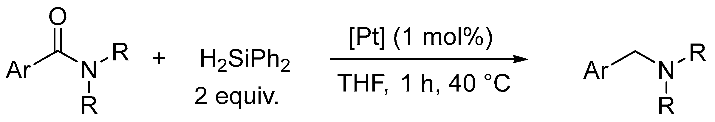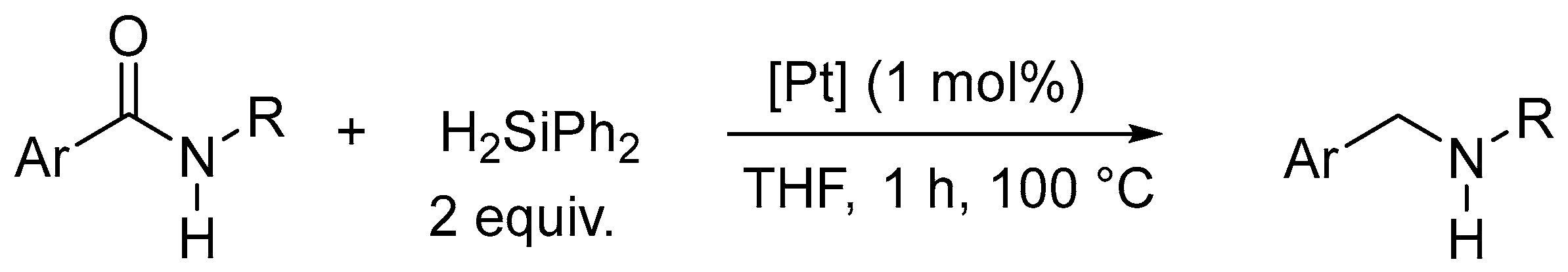 - Pisiewicz, S.; Junge, K.; Beller, M. Mild Hydrosilylation of Amides by Platinum N-Heterocyclic Carbene Catalysts. Eur. J. Inorg. Chem. 2014, 14, 2345–2349. [Google Scholar] [CrossRef]