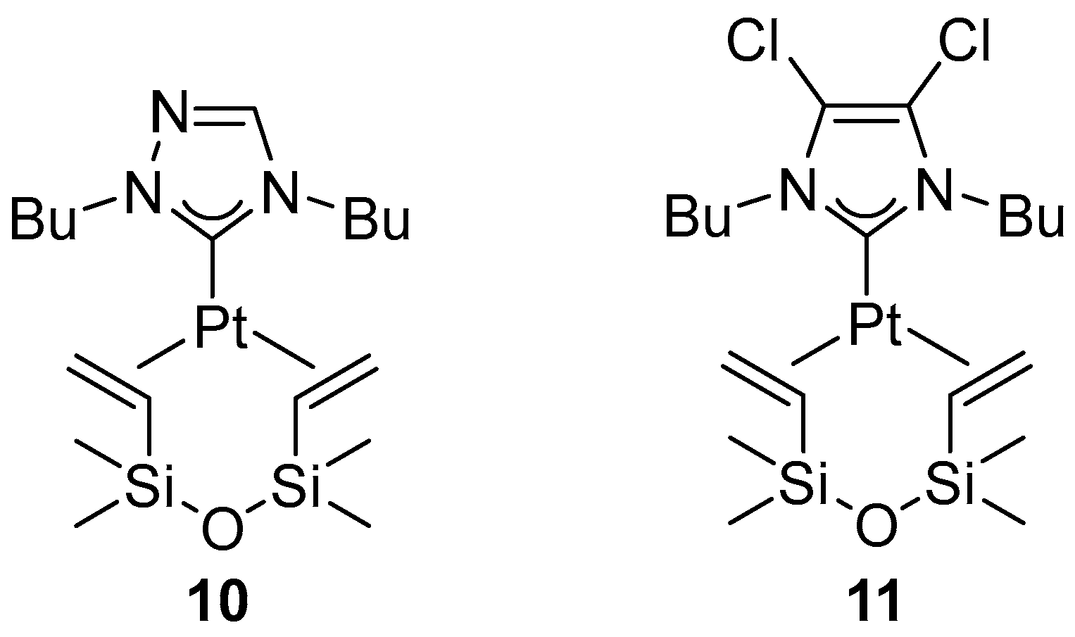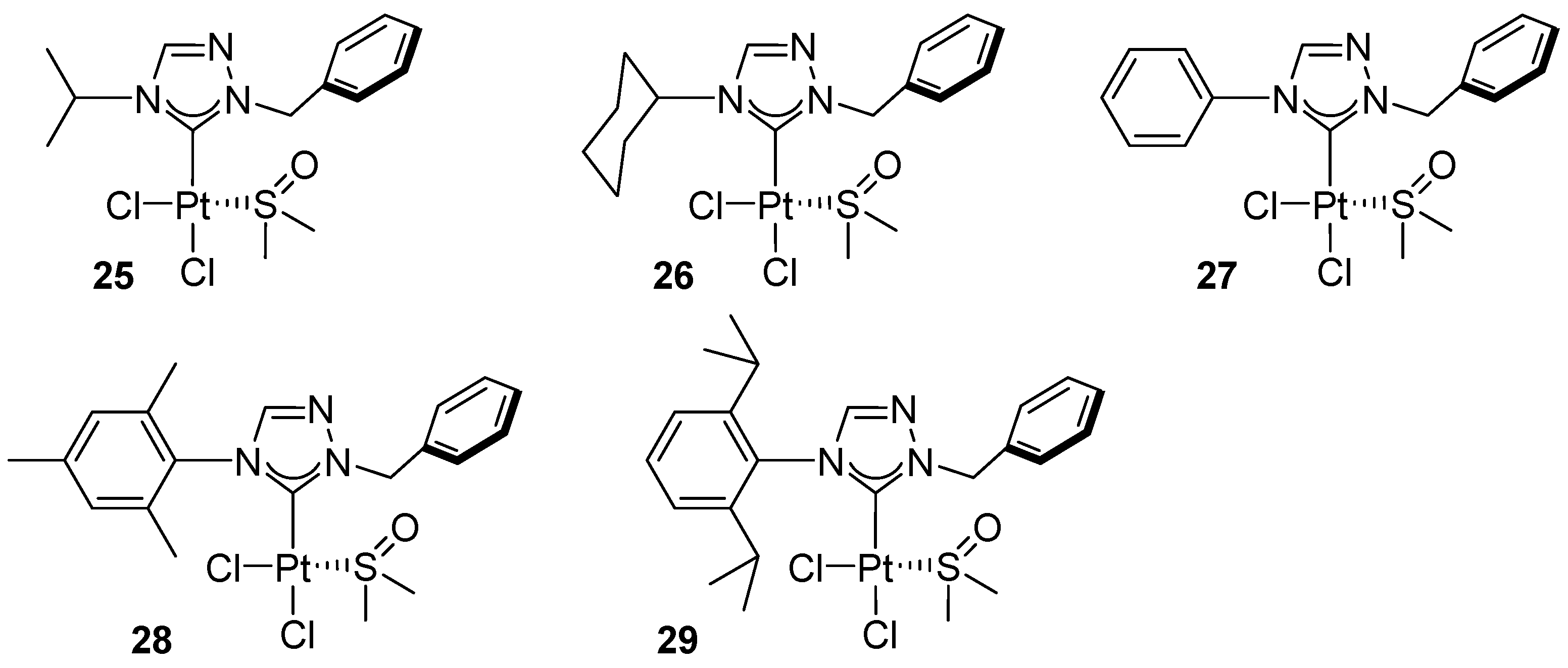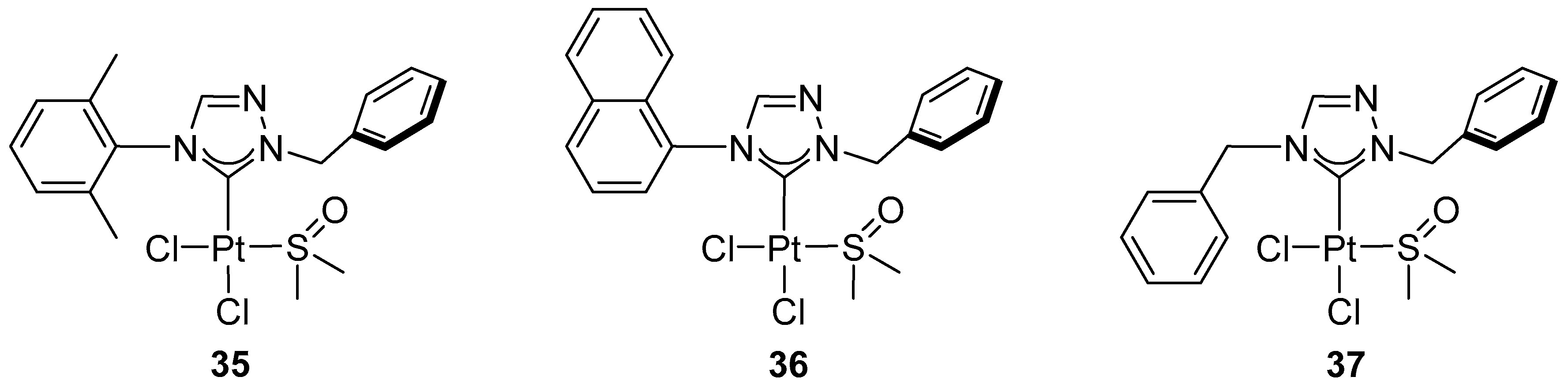 - Nguyen, V.H.; Dang, T.T.; Nguyen, H.H.; Huynh, H.V. Platinum(II) 1,2,4-Triazolin-5-Ylidene Complexes: Stereoelectronic Influences on Their Catalytic Activity in Hydroelementation Reactions. Organometallics 2020, 39, 2309–2319. [Google Scholar] [CrossRef]