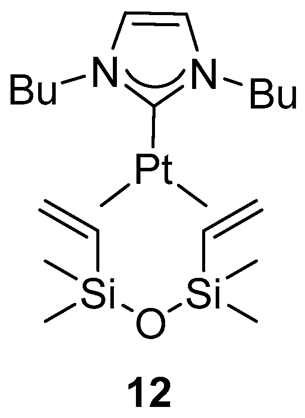 - Maliszewski, B.P.; Casillo, E.; Scattolin, T.; Nahra, F.; Cazin, C.S.J.; Nolan, S.P. Unveiling the Potential of Platinum in Homogeneous Catalysis: A Review of Pt-NHC Chemistry and Pt-Catalysed Hydrosilylation Reactions: Part II. Johns. Matthey Technol. Rev. 2026, in press. [Google Scholar]