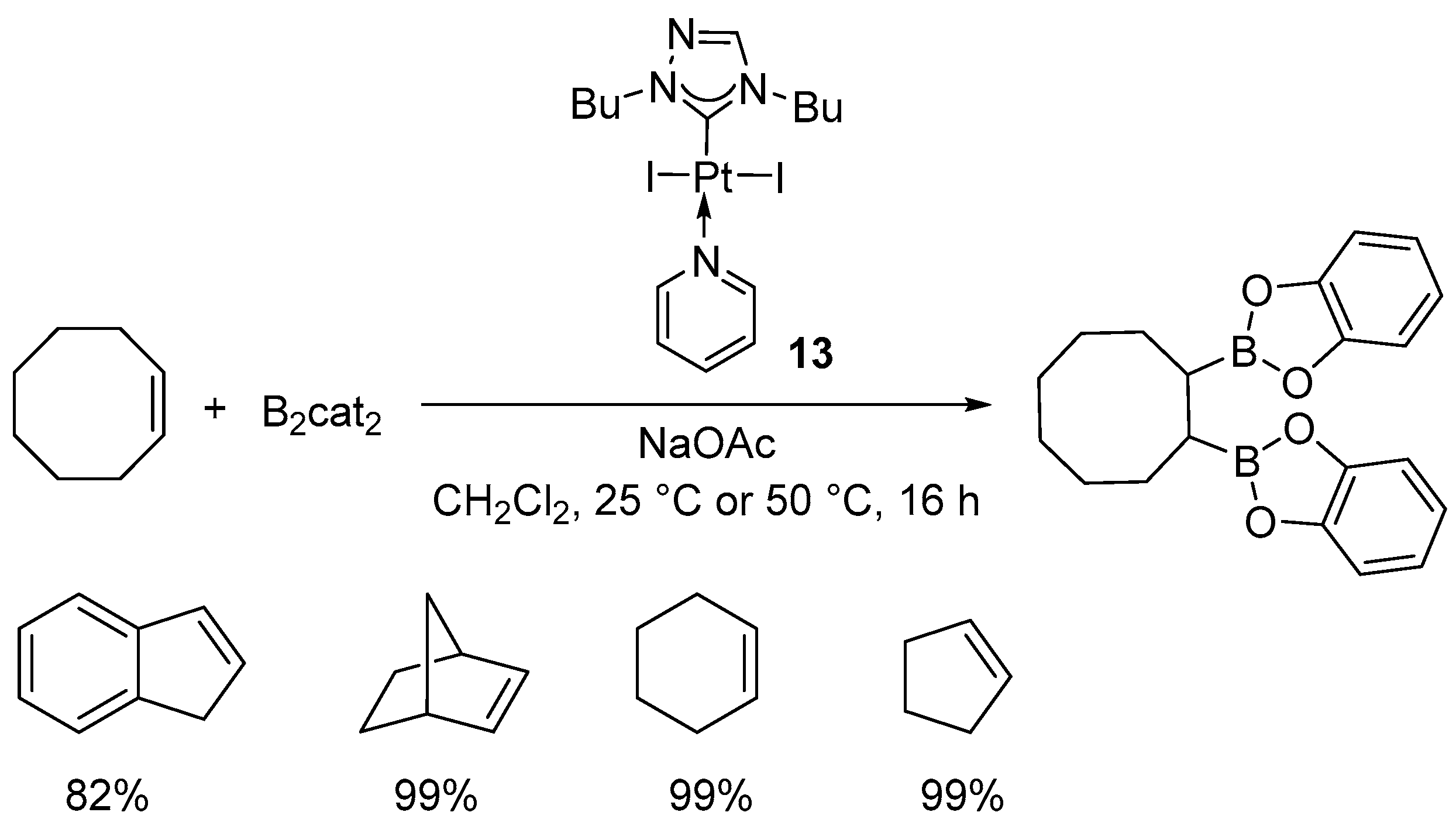 - Pubill-Ulldemolins, C.; Bo, C.; Mata, J.A.; Fernández, E. Perceptible Influence of Pd and Pt Heterocyclic Carbene–Pyridyl Complexes in Catalytic Diboration of Cyclic Alkenes. Chem. Asian J. 2010, 5, 261–264. [Google Scholar] [CrossRef]