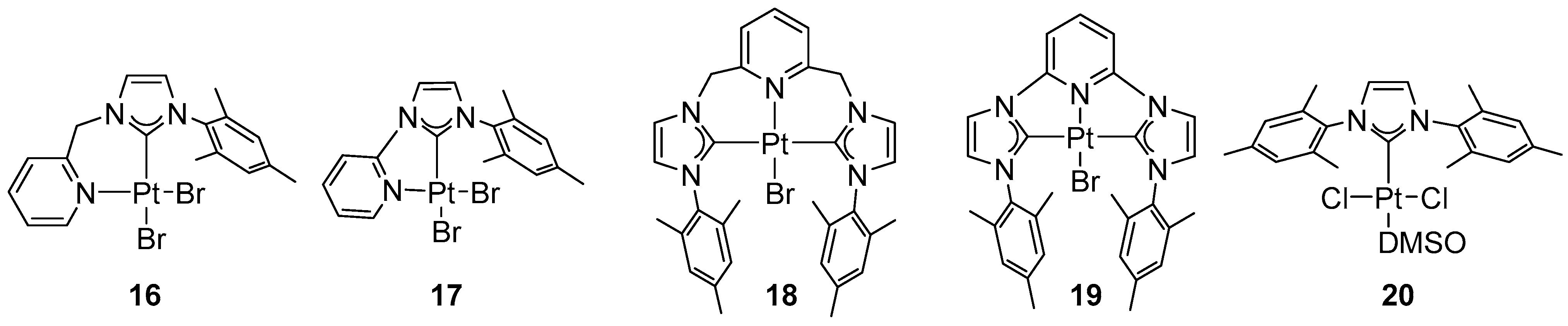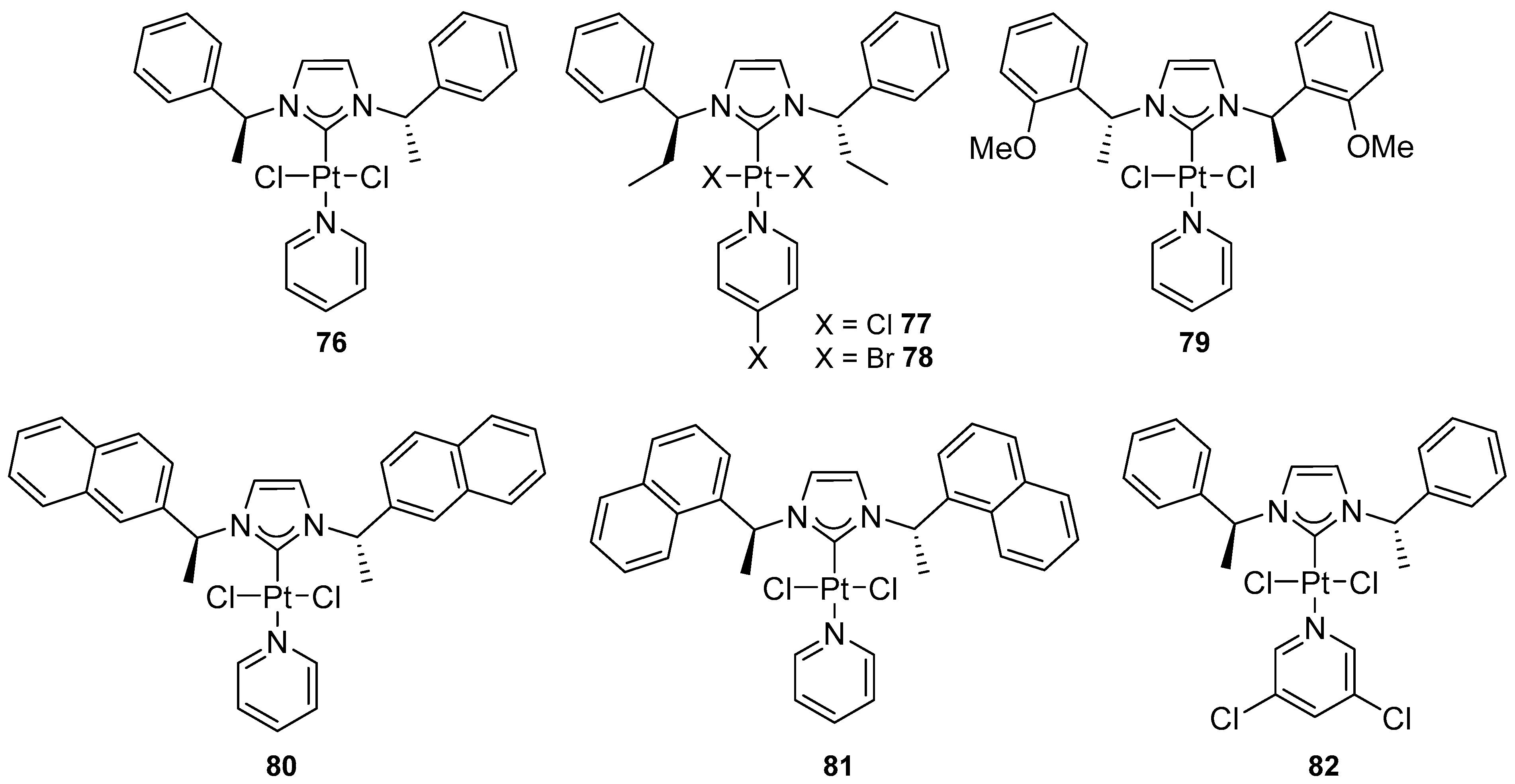 - Pertschi, R.; Hatey, D.; Pale, P.; De Frémont, P.; Blanc, A. Synthesis, Characterization, and Catalytic Activity of Chiral NHC Platinum(II) Pyridine Dihalide Complexes. Organometallics 2020, 39, 804–812. [Google Scholar] [CrossRef]