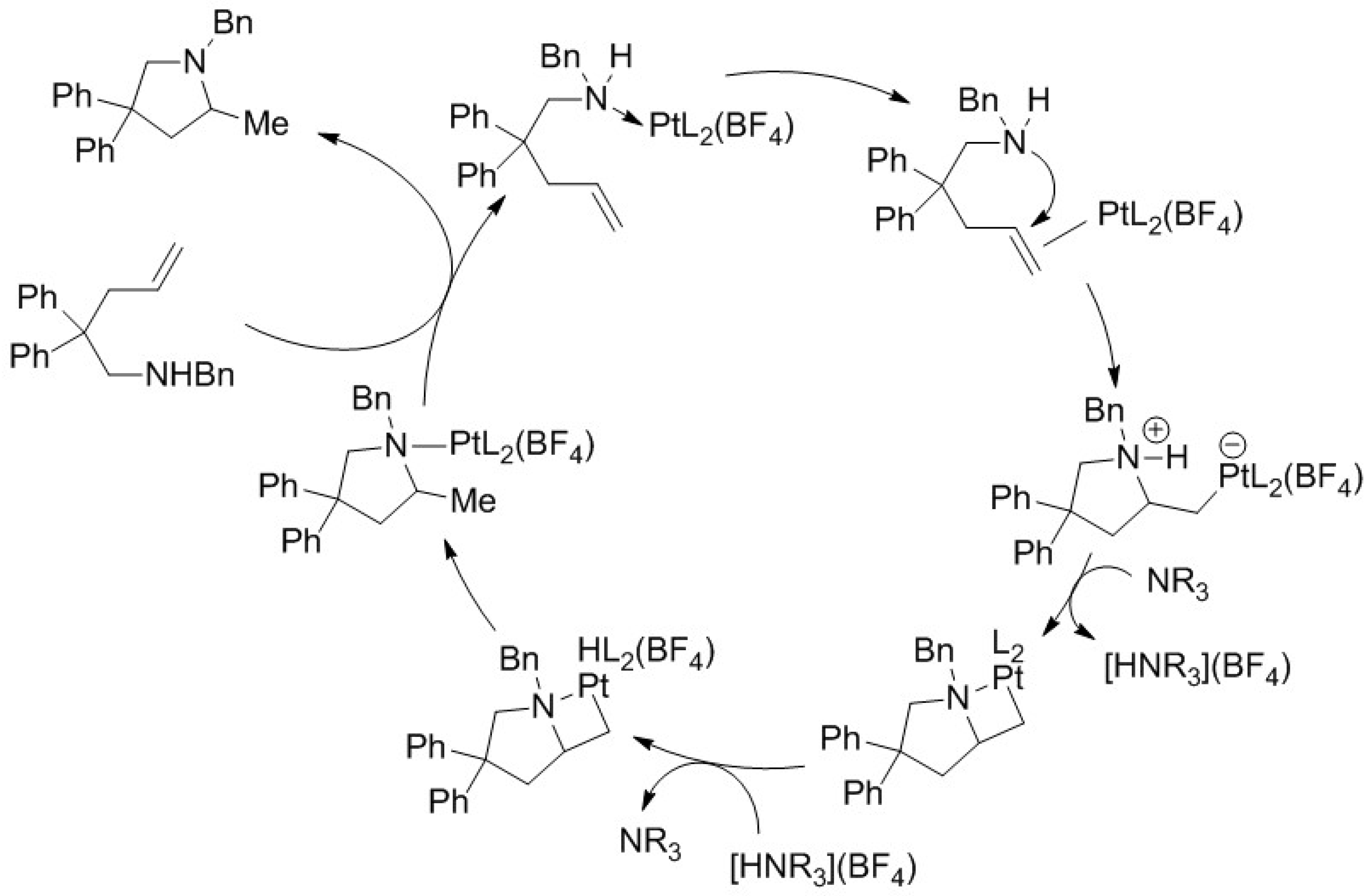 - Zhang, R.; Xu, Q.; Mei, L.; Li, S.; Shi, M. A N-Heterocyclic Carbene (NHC) Platinum Complex as Pre-Catalyst for the Intramolecular Hydroamination of Olefins with Secondary Alkylamines and Oxidative Amination of ω-Alkenic Amines. Tetrahedron 2012, 68, 3172–3178. [Google Scholar] [CrossRef]