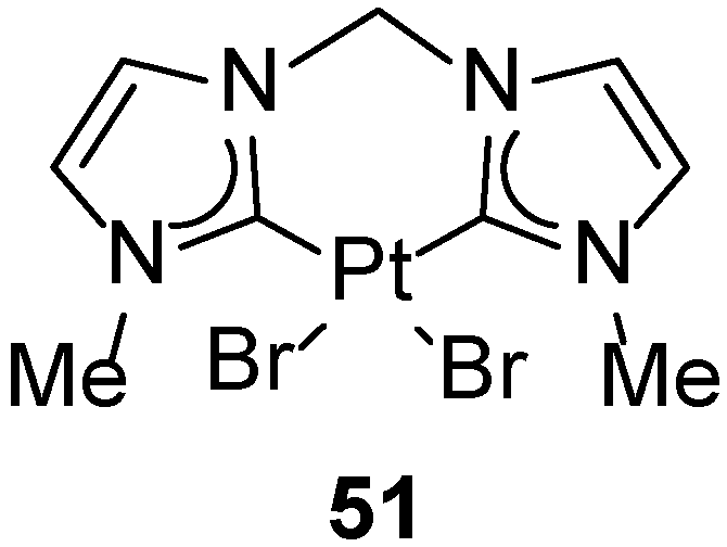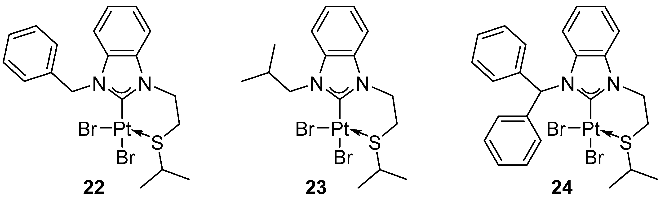 - Bernhammer, J.C.; Huynh, H.V. Platinum(II) Complexes with Thioether-Functionalized Benzimidazolin-2-Ylidene Ligands: Synthesis, Structural Characterization, and Application in Hydroelementation Reactions. Organometallics 2014, 33, 172–180. [Google Scholar] [CrossRef]