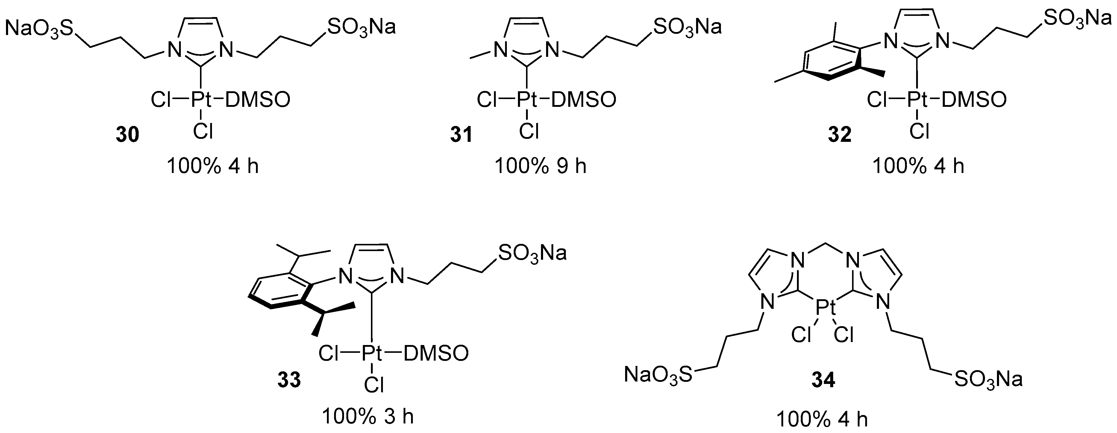 - Baquero, E.A.; Silbestri, G.F.; Gómez-Sal, P.; Flores, J.C.; De Jesús, E. Sulfonated Water-Soluble N-Heterocyclic Carbene Silver(I) Complexes: Behavior in Aqueous Medium and as NHC-Transfer Agents to Platinum(II). Organometallics 2013, 32, 2814–2826. [Google Scholar] [CrossRef]