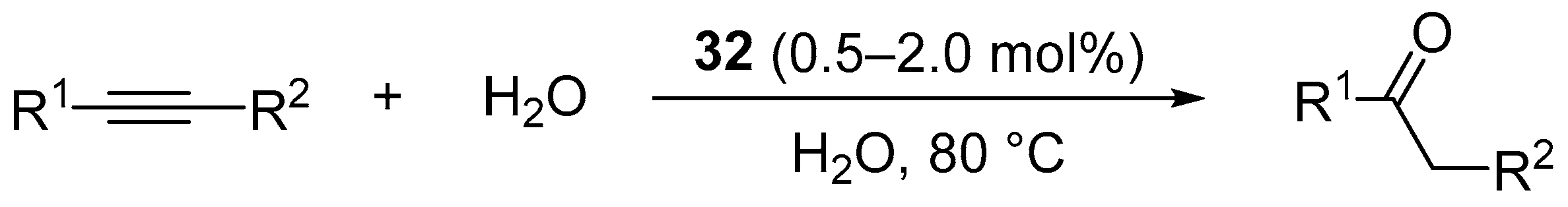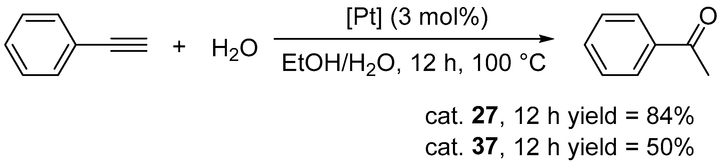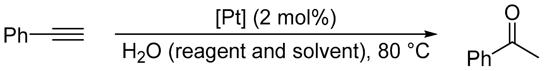 - Hartman, J.W.; Hiscox, W.C.; Jennings, P.W. Catalytic Hydration of Alkynes with Platinum(II) Complexes. J. Org. Chem. 1993, 58, 7613–7614. [Google Scholar] [CrossRef]