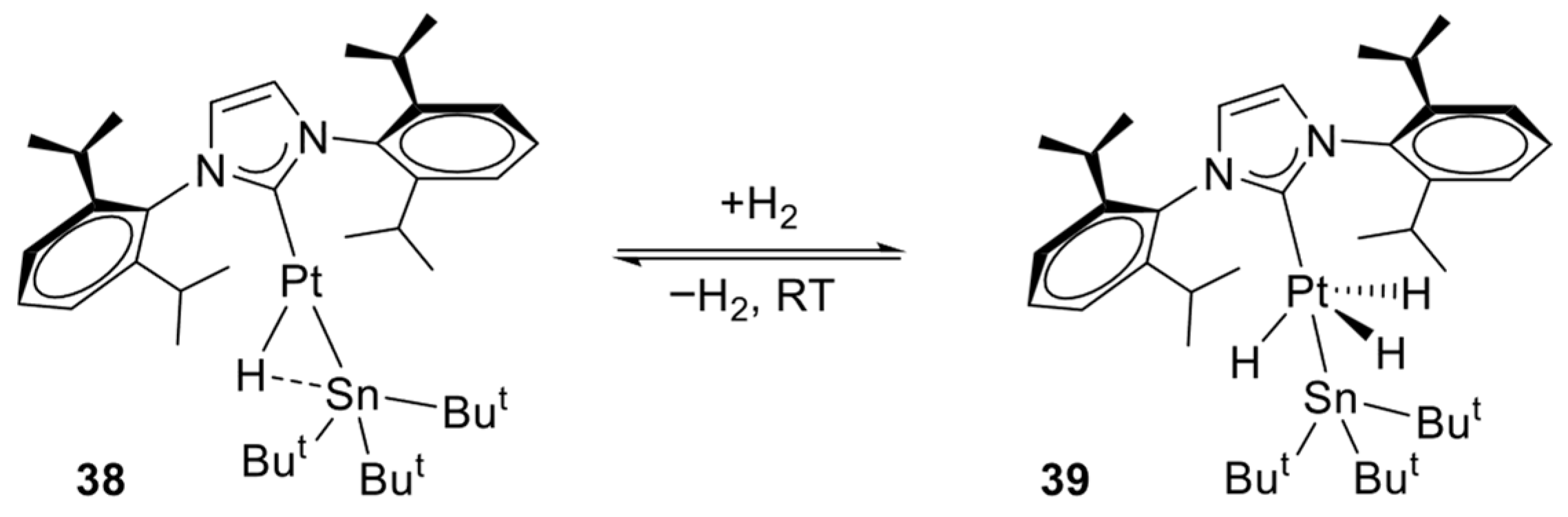 - Koppaka, A.; Captain, B. Reversible Inter- and Intramolecular Carbon–Hydrogen Activation, Hydrogen Addition, and Catalysis by the Unsaturated Complex Pt(IPr)(SnBut3)(H). Inorg. Chem. 2016, 55, 2679–2681. [Google Scholar] [CrossRef]