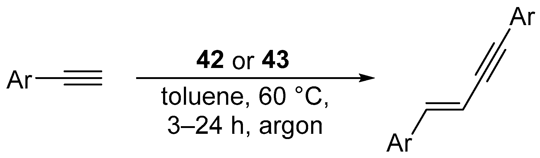 - Żak, P.; Bołt, M.; Lorkowski, J.; Kubicki, M.; Pietraszuk, C. Platinum Complexes Bearing Bulky N-Heterocyclic Carbene Ligands as Efficient Catalysts for the Fully Selective Dimerization of Terminal Alkynes. ChemCatChem 2017, 9, 3627–3631. [Google Scholar] [CrossRef]