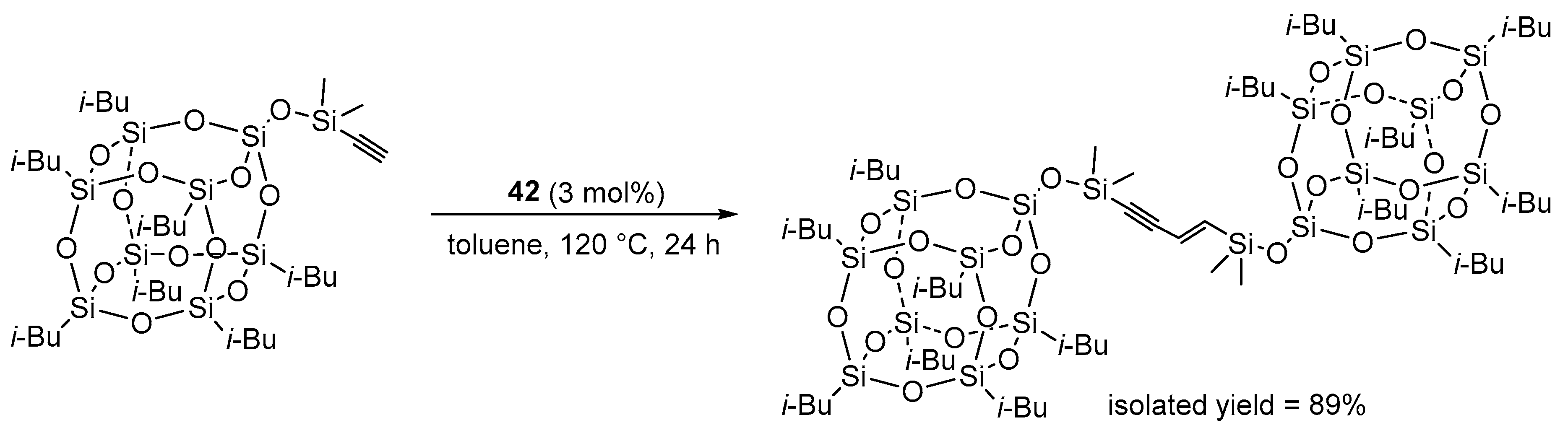 - Żak, P.; Bołt, M.; Dudziec, B.; Kubicki, M. Synthesis of (E)-1,4-Disilsesquioxylsubstituted but-1-En-3-Ynes via Platinum-Catalyzed Dimerization of Ethynylsiloxysilsesquioxanes. Dalton Trans. 2019, 48, 2657–2663. [Google Scholar] [CrossRef]
