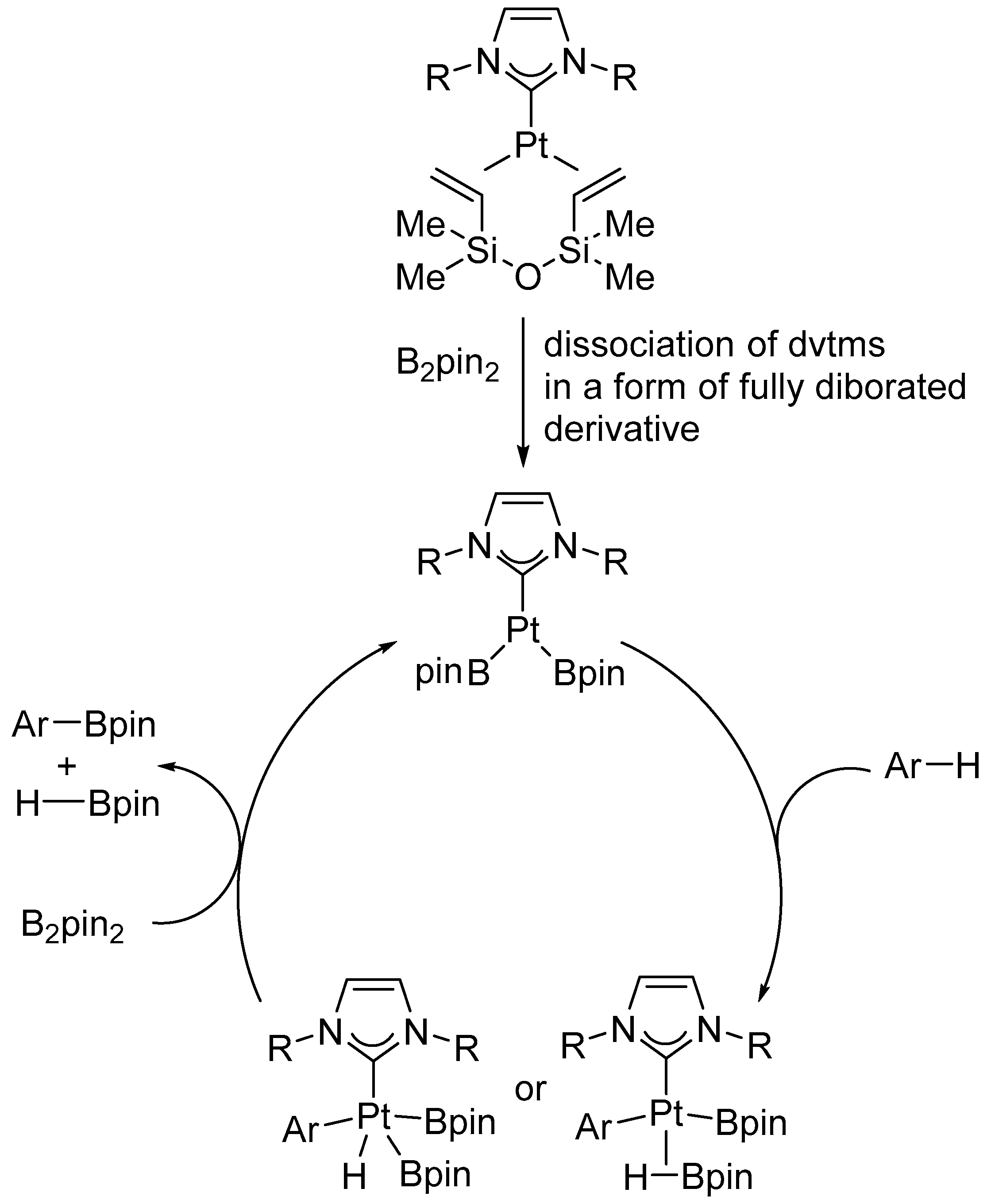 - Lillo, V.; Mata, J.A.; Segarra, A.M.; Peris, E.; Fernandez, E. The Active Role of NHC Ligands in Platinum-Mediated Tandem Hydroboration–Cross-Coupling Reactions. Chem. Commun. 2007, 21, 2184–2186. [Google Scholar] [CrossRef]