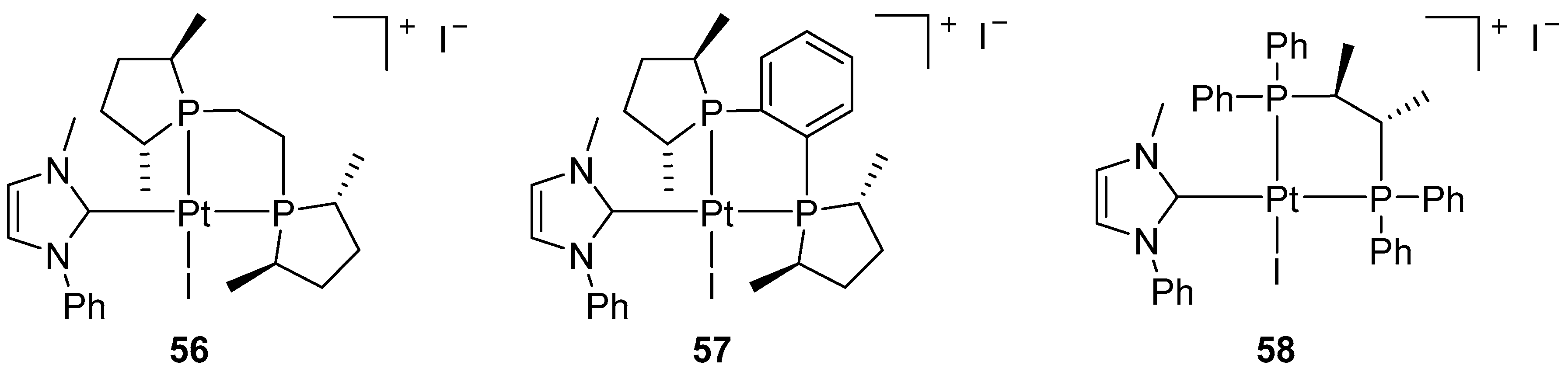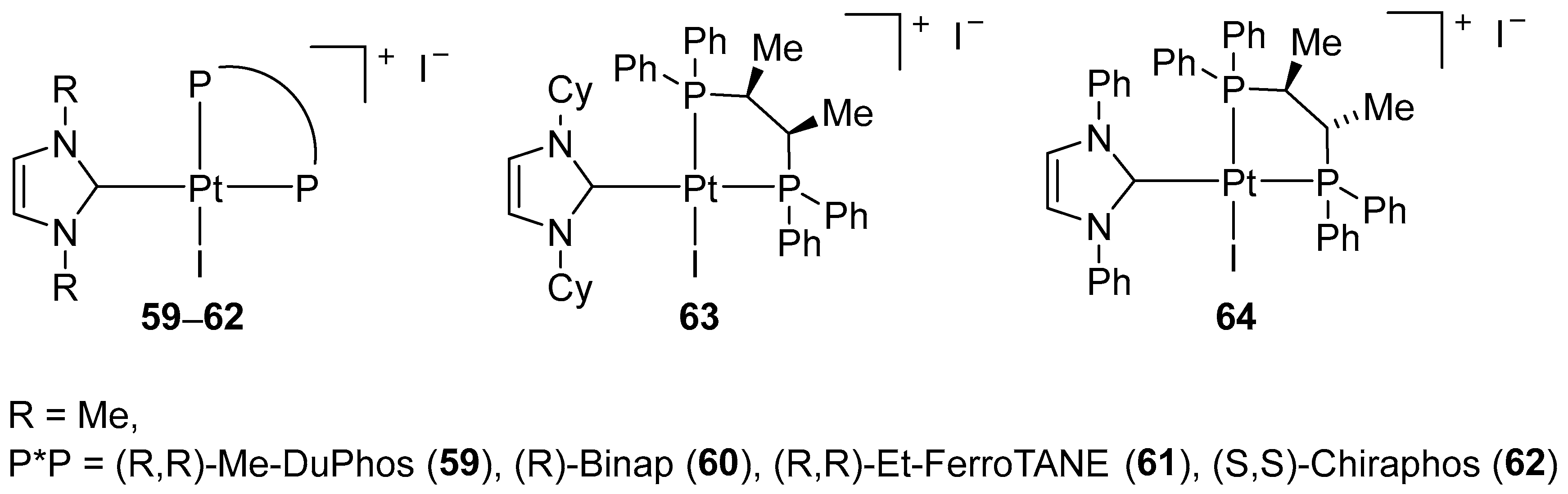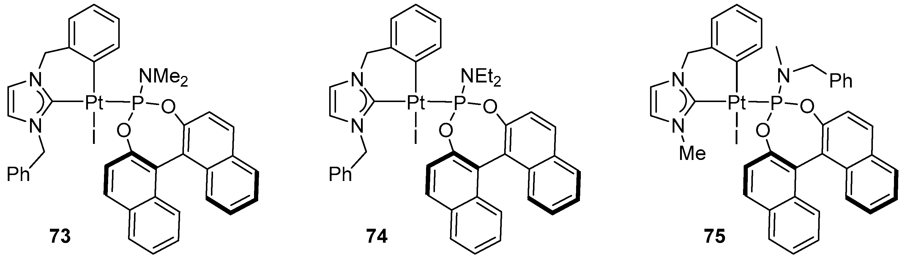 - Brissy, D.; Skander, M.; Retailleau, P.; Frison, G.; Marinetti, A. Platinum(II) Complexes Featuring Chiral Diphosphines and N-Heterocyclic Carbene Ligands: Synthesis and Evaluation as Cycloisomerization Catalysts. Organometallics 2009, 28, 140–151. [Google Scholar] [CrossRef]