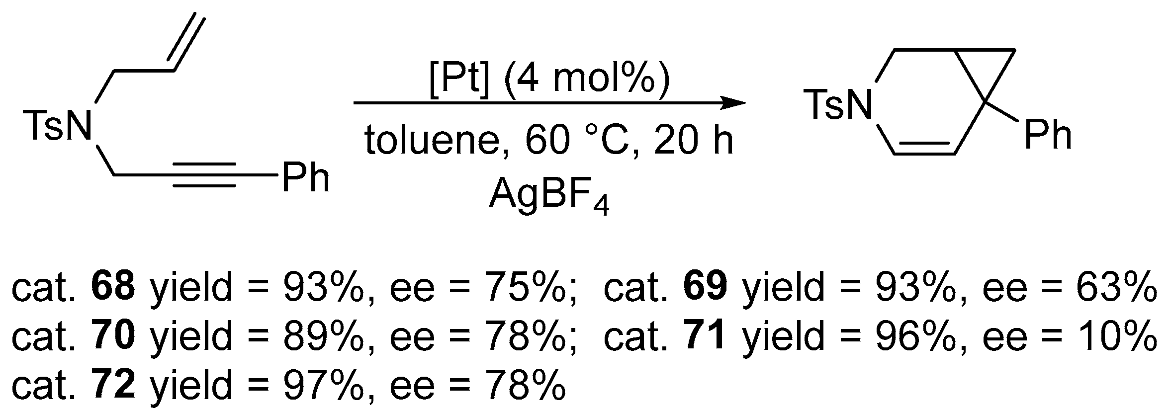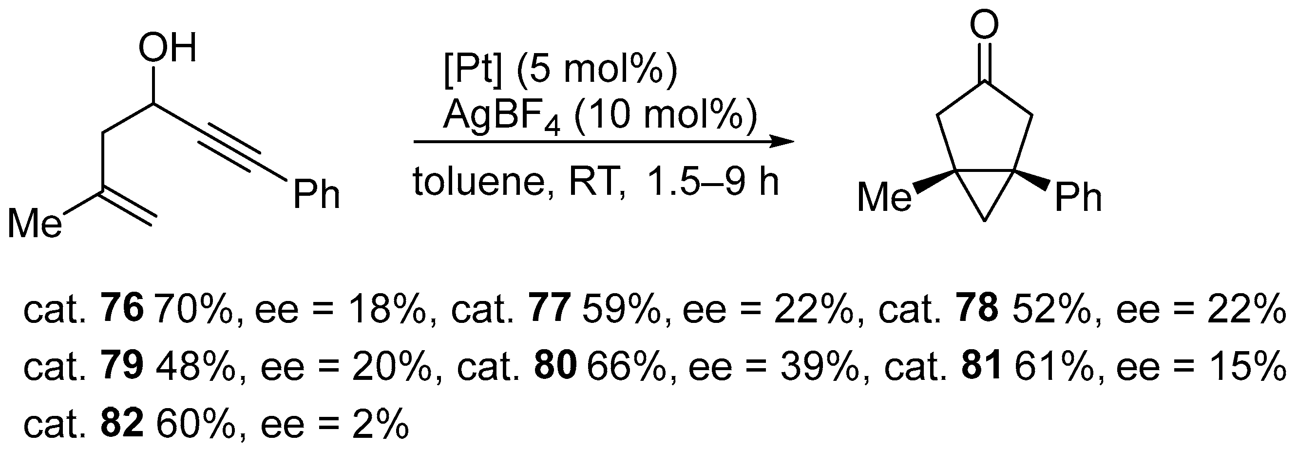 - Zhang, Y.; Jullien, H.; Brissy, D.; Retailleau, P.; Voituriez, A.; Marinetti, A. Platinum(II) Catalyzed Enantioselective Cycloisomerizations of 3-Hydroxylated 1,5-Enynes. ChemCatChem 2013, 5, 2051–2057. [Google Scholar] [CrossRef]