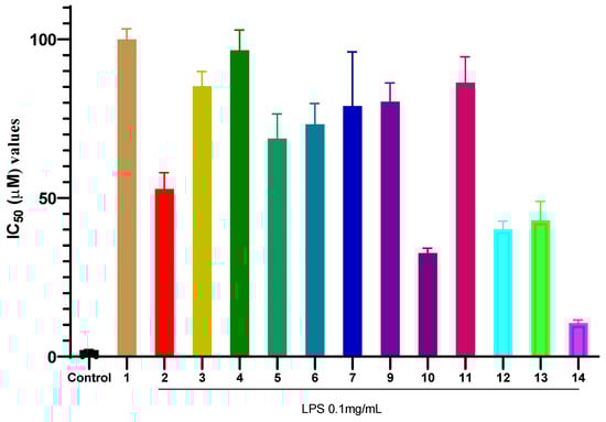 The ability of compound 14 to inhibit intracellular NO production with LPS stimulation. Data are presented as mean ± SD of three independent experiments, each performed in triplicate (n = 3). ****: p < 0.0001 compared to the treatment with only the presence of LPS.