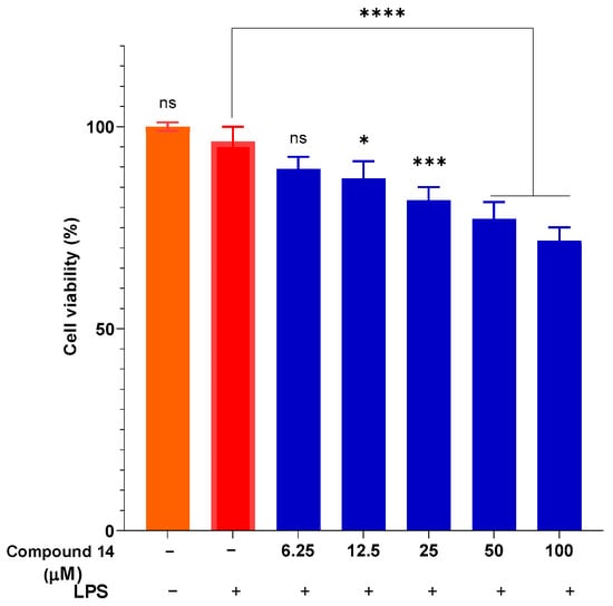 Cytotoxicity of compound 14 in the presence of LPS. Data are presented as mean ± SD of three independent experiments, each performed in triplicate (n = 3). ****: p < 0.0001, ***: p < 0.001, and *: p < 0.05 compared to cells cultured under normal conditions; n.s.: not significant.