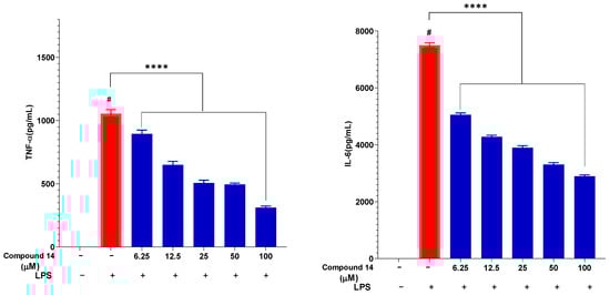 The effect of compound 14 on the secretion of key pro-inflammatory cytokines, TNF-α and IL-6, was also evaluated in a dose-dependent manner (Figure 5). LPS stimulation markedly increased TNF-α and IL-6 levels to 1055 ± 30.65 pg/mL and 7500 ± 80.34 pg/mL, respectively. Pre-treatment with compound 14 significantly reduced the release of both cytokines in a concentration-dependent manner. At 100 µM, TNF-α and IL-6 levels were suppressed to 311 ± 12.05 pg/mL and 2895 ± 45.21 pg/mL, corresponding to inhibition rates of approximately 70% and 61%, respectively. This dual cytokine suppression suggests that compound 14 acts on upstream regulators of the inflammatory cascade, potentially through modulation of shared signaling pathways such as NF-κB.