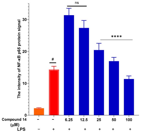 Inhibition of NF-κB p65 nuclear translocation by compound 14: Quantification of nuclear p65 fluorescence intensity. Data points represent individual cells from three independent experiments (total n = 36 cells). Values are mean ± SEM. #: p < 0.05 (compared to cells cultured under normal conditions); ****: p < 0.0001 (compared to cells stimulated with LPS). n.s.: no significant difference.