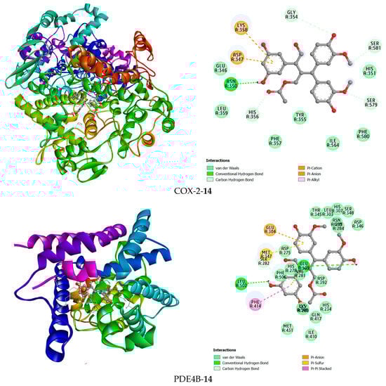 Docking studies were conducted in this research to better understand the potential anti-inflammatory capabilities of compound 14 against known targets, including the enzymes COX-2 and PDE4B. Before evaluation, the docking protocol was validated by redocking the co-crystallized ligands into the active sites of the studied enzymes. The results described in Figure 7 show that the calculated RMSD values were 1.672 Å and 0.615 Å for rofecoxib in the COX-2 protein and NVW in the PDE4B protein, respectively. RMSD values below 2 Å indicate that the docking protocol has high predictive reliability and was thus used in the current study [62]. Subsequently, compound 14 was docked into the active sites of the studied enzymes. The best binding positions of the ligand with COX-2 and PDE4B are shown in Figure 7, indicating their interactions with the amino acid residues of these proteins. The binding affinities of compound 14 and the reference compounds were also calculated, providing a basis for assessing how these ligands bind to the target proteins COX-2 and PDE4B, as shown in Table 1. It can be seen that compound 14 exhibits predicted binding affinity values of −6.138 kcal/mol and −9.361 kcal/mol for the COX-2 and PDE4B proteins, respectively. The value for PDE4B indicates a strong predicted affinity in silico. However, compared to the high-affinity reference inhibitors rofecoxib (COX-2: −8.9 kcal/mol) and NVW (PDE4B: −12.05 kcal/mol), compound 14 shows weaker predicted binding for both targets. Notably, the docking pose for PDE4B reveals interactions with key residues like Phe414 in the hydrophobic clamp, a feature critical for known PDE4 inhibitors, which may explain its significant activity in subsequent cellular assays despite the lower predicted affinity score relative to NVW. A binding interaction analysis was conducted and is depicted in Figure 8.