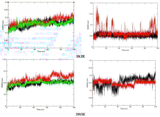 The RMSD plots of protein in systems (left) and ligand in systems (right). The systems are color-coded as apo (black), reference (red), and ligand 14 (green).