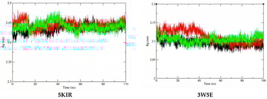 The Rg was estimated in this study to reflect the compactness of the investigated complexes. The average Rg values calculated for the 14-5KIR, 14-3W5E, rofecoxib-5KIR, and NVW-3W5E complexes were 2.441395 nm, 2.104632964 nm, 2.444086 nm, and 2.111742684 nm, respectively (Figure 10). There were no structural changes in the acetylcholinesterase configuration in the presence of the ligands, and a stable equilibrium radius of gyration was established, implying the stability of the complexes during the 100 ns simulation. The calculated Rg values of the studied systems are shown in Figure 10. This high structural stability suggests that researchers should experimentally test these compounds in vitro and in vivo to elucidate their anti-inflammatory mechanisms.