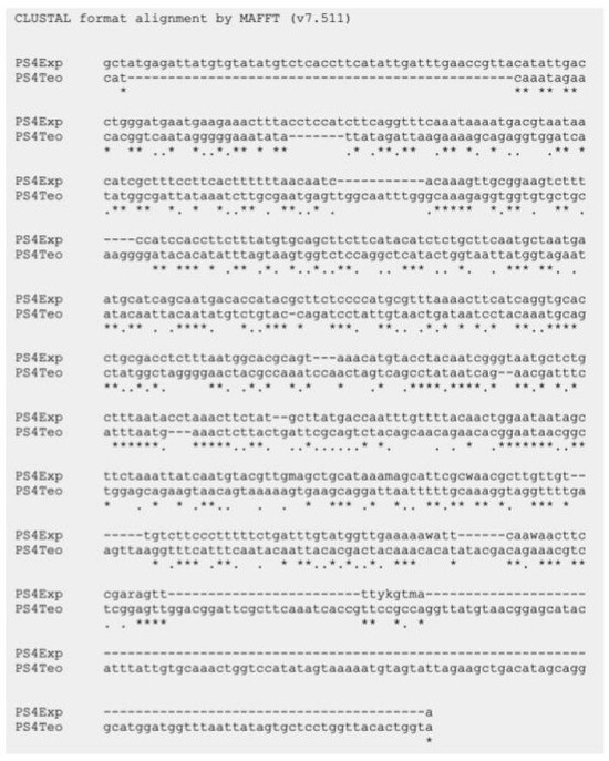 As mentioned above, six parasporin groups have been recognized to date, designated PS1 through PS6 [3,4]. Thus, to establish in which group AX-2 PCR belong, amplification of the PS1–PS6 genes from the AX strain was performed. PCR results for PS1 to PS6 showed nonspecific bands for each DNA amplicon, although PS4 showed a clear and specific amplification of ~600 bp, suggesting that AX-2 is a PS4 parasporin (Figure 4). Only two sequences of PS4 have been reported to this day: PS4Aa1 (NCBI accession number AB180980.2) and parasporin 4 (WP_029440439). The 600 bp amplification alignment using MAFFT software version 7 with reported PS4 sequences showed a low percentage of identity with PS4Aa1 (38%, Figure 5) and no significant similarity with parasporin 4 (Figure S1).