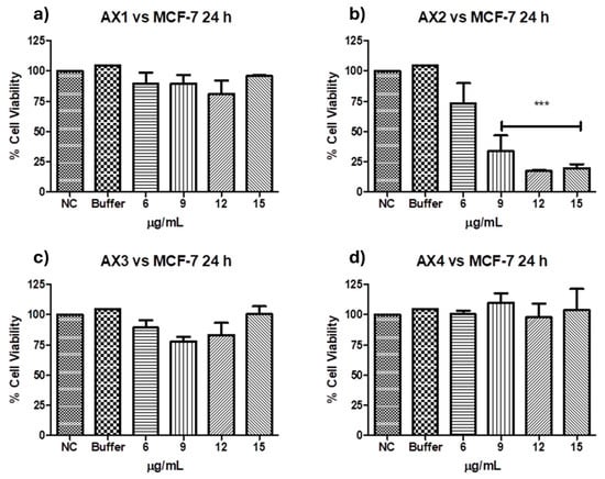 At this point, only AX-2 showed cytotoxic activity against MCF-7 cells; thus, assays were performed using only AX-2 protein.