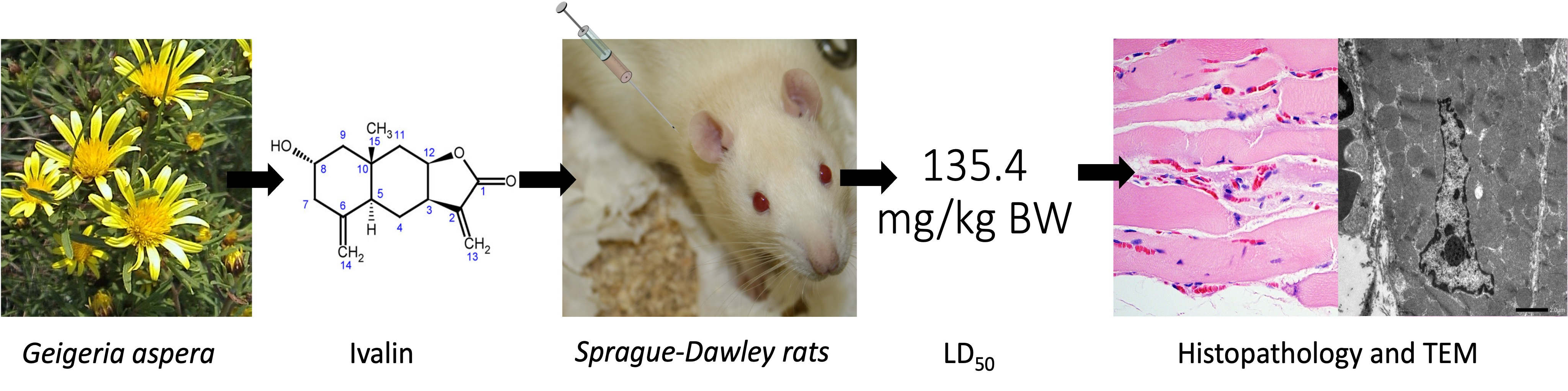 A validated rodent model following parenteral exposure would therefore be practically and economically valuable for further study of sesquiterpene toxicity and toxicodynamics, and to validate in vitro findings. The toxicity of sesquiterpene lactones from Geigeria spp. has also not been determined in rodents. The aim of this study was to determine the LD50 of ivalin, extracted and purified from Geigeria aspera Harv., in Sprague–Dawley rats, and to assess the correlation of muscle toxicosis between ruminants and rats when exposed by different routes.