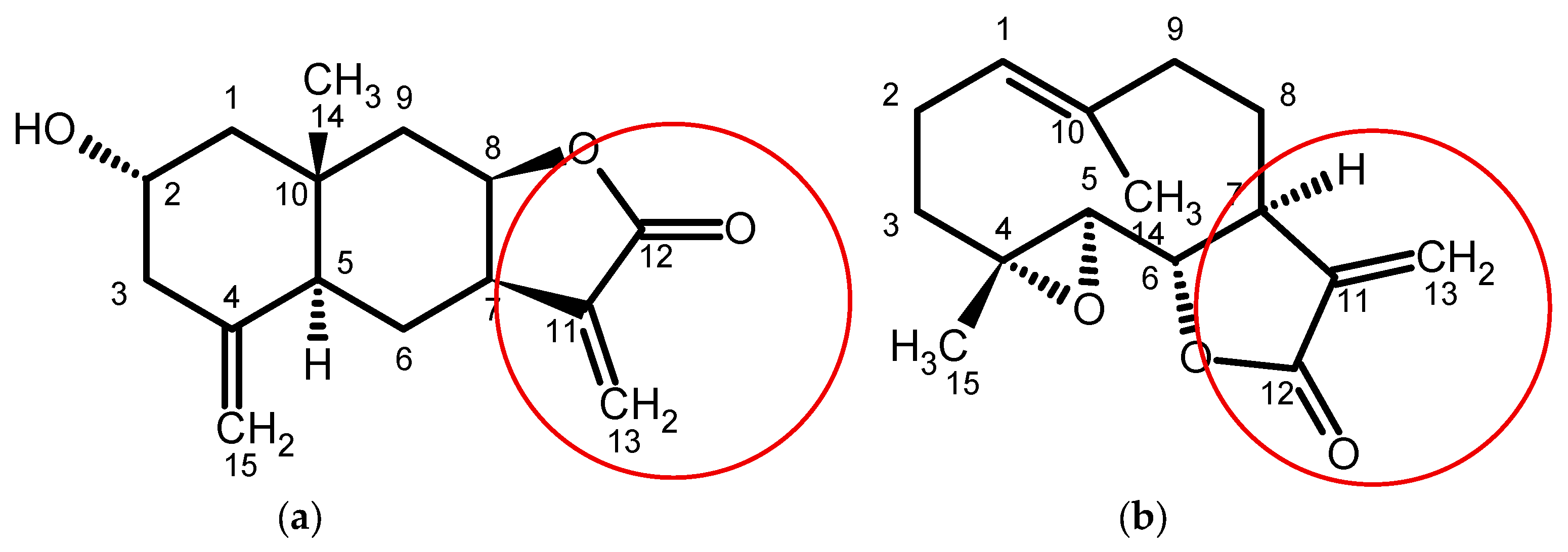8. Picman, A.K. Biological activities of sesquiterpene lactones. Biochem. Syst. Ecol. 1986, 14, 255–281. [Google Scholar] [CrossRef]
