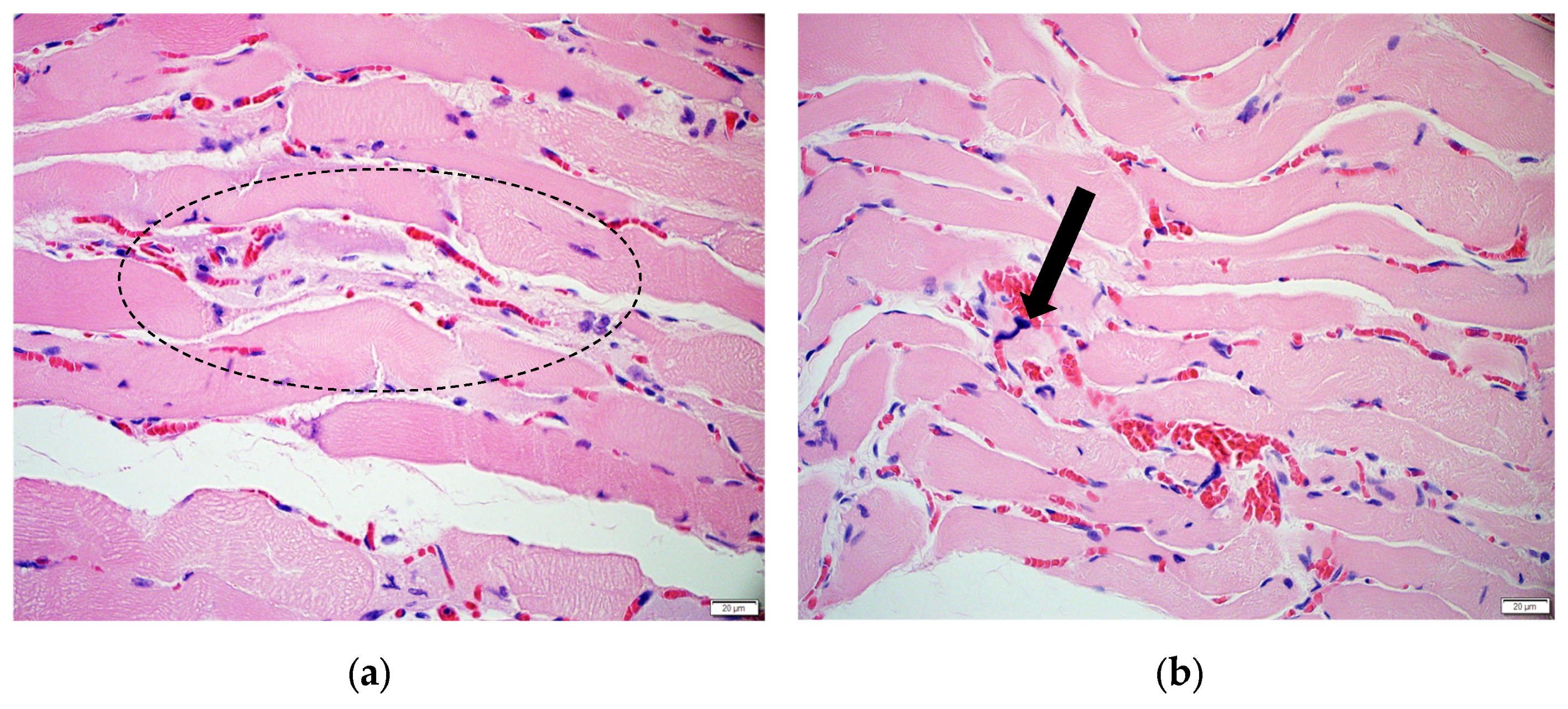 In rat 1 (ivalin dose 123 mg/kg BW) and to a lesser degree in rat 6 (ivalin dose 219 mg/kg BW), the diaphragm exhibited mild multifocal vacuolisation within the myofibre sarcoplasm, typically associated with segmental myofibre enlargement and loss of cross-striations. Multifocal lytic changes were detected in a few myofibre segments, accompanied by sarcoplasmic fragmentation, and sparse infiltration of macrophages (Figure 2a). Additionally, some myonuclei appeared irregularly enlarged and darkly stained, with unstructured chromatin; the nuclear membranes were disrupted, and the nuclear content appeared lysed. Increased numbers of internal myonuclei were observed (Figure 2b).