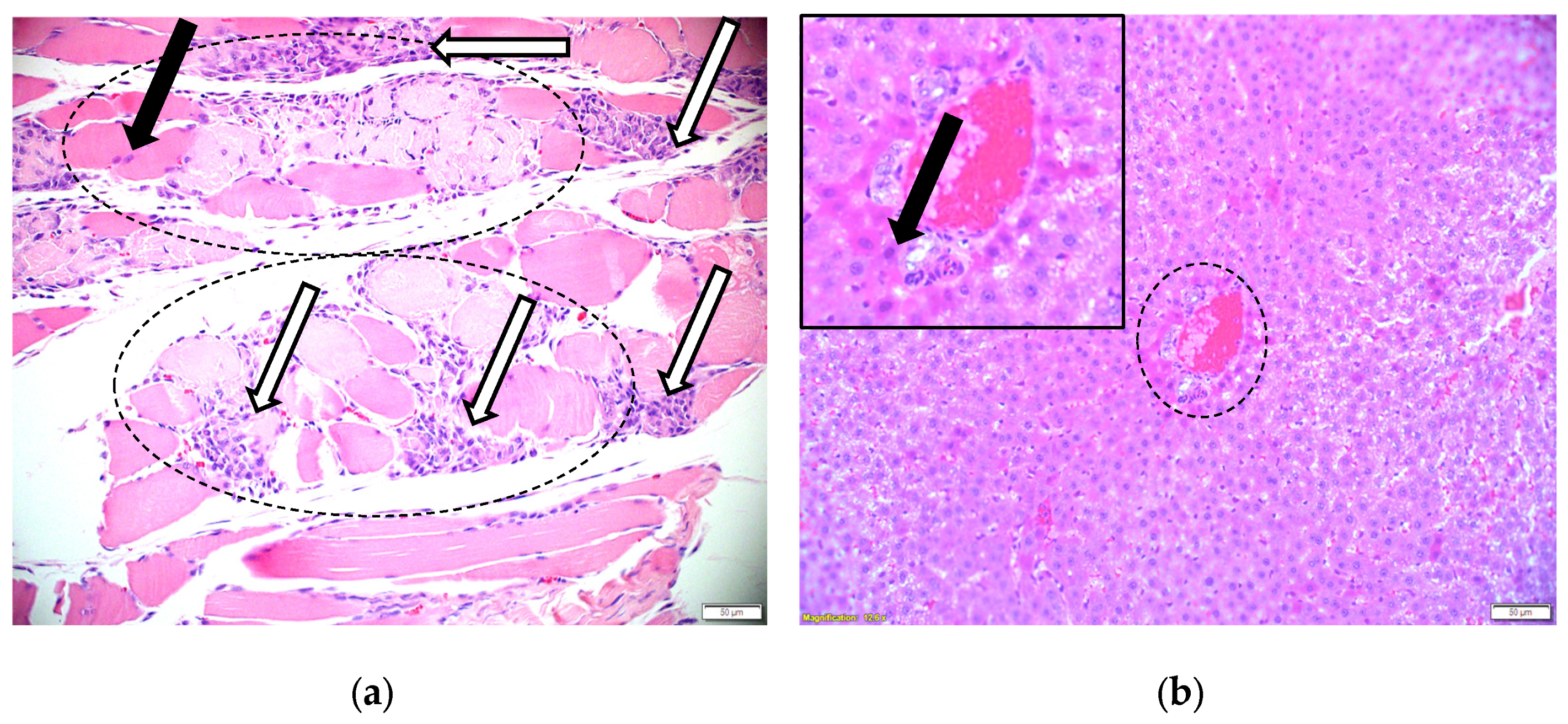 Figure 3. Skeletal muscle and hepatic changes in ivalin-exposed rat 2. (a) Transverse section of Musculus triceps brachii demonstrating mild to moderate myofibre swelling (dashed ovals), sarcoplasmic hypereosinophilia (black arrow), myofibre fragmentation/lysis with prominent macrophagic infiltration (white arrows), and sarcolemmal nuclear proliferation. (H&E ×20). (b) Periportal hypereosinophilia (dashed oval) and pyknotic nuclei (arrow in insert) (H&E ×20).