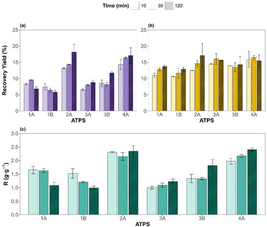 Top-phase results for the recovery yields of (a) proteins and (b) carbohydrates, in mass percentage; (c) depicts the protein-to-carbohydrate mass ratio (R) for each ATPS (x-axis) and different times (different pattern). Experimental data are shown as mean ± SD (n = 2).