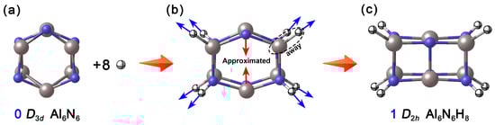 Previous studies have reported a fully hydrogenated Al6N6H12 [25] cluster that formally achieves tetracoordinate saturation by introducing one H atom to each Al and N atom of the pristine Al6N6. Nevertheless, this structure merely supplements the coordination number through the formation of Al–H and N–H bonds without altering the symmetry and hexagonal prism geometric framework of the Al6N6 core. Essentially, it is merely a “hydrogenated derivative” of the original structure, failing to induce substantial geometric reconstruction. This naturally leads to the following question: can hydrogenation be rationally designed to effectively modulate both the geometry and electronic properties of AlN clusters?