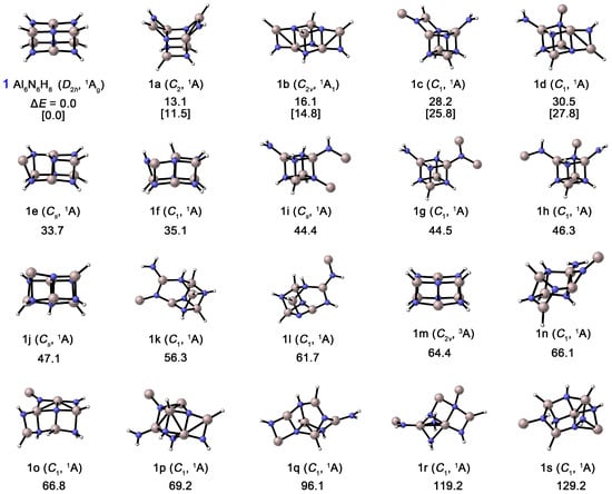 Optimized global-minimum structures of Al6N6H8 (1) and the nineteen lowest-lying isomers (1a–1s). Relative energies are shown in kcal mol−1 at the PBE0/def2-TZVPP level. Also shown are energetics data for the top 5 lowest-energy isomers at the single-point CCSD(T)/def2-TZVPP//PBE0/def2-TZVPP level with zero-point energy (ZPE) corrections at PBE0 (in square brackets).