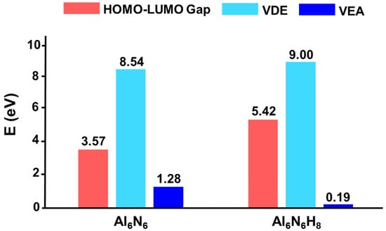 The HOMO–LUMO gap serves as a critical indicator of a cluster’s electronic stability, revealing its propensity to participate in chemical reactions. Generally, a larger HOMO–LUMO gap correlates with higher chemical stability. As shown in Figure 7, the HOMO–LUMO gap of Al6N6 (0) is 3.57 eV. Interestingly, hydrogenation leads to a significant enhancement in electronic stability, with the gap increasing to 5.42 eV for Al6N6H8 (1), which is 1.85 eV higher than that of 0. This indicates that hydrogen incorporation effectively modulates the electronic structure, endowing 1 with considerably improved electronic stability. Furthermore, the vertical detachment energy (VDE) and vertical electron affinity (VEA) of both clusters were calculated at the OVGF/def2-TZVPP level. For a neutral cluster, a higher VDE value reflects greater resistance to electron loss, while a lower VEA value suggests a reduced tendency to accept an additional electron. The computed VDE of 1 is 9.00 eV, which is higher than that of 0 (8.54 eV), while its VEA is 0.19 eV, which is substantially lower than the 1.28 eV of 0. These results indicate that hydrogenation renders cluster 1 more resistant to both electron loss and electron capture, confirming that its electronic structure is more robust than that of its precursor.