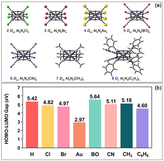(a) PBE0/def2-TZVPP-optimized structures of Al6N6E8 (E = Cl, Br, Au, BO, CN, CH3, C6H5, 2–8). (b) Comparison of the HOMO-LUMO gap among 2–8.